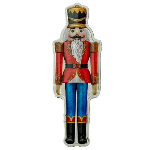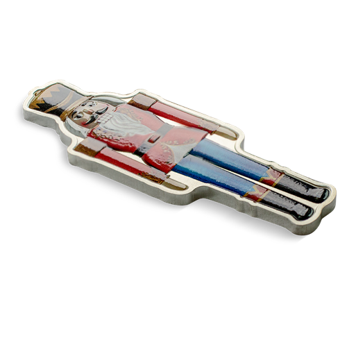 A classic holiday ballet, no other character is as central to The Nutcracker as thecolorful, wooden nutcracker itself. Carved in the likeness of a foot soldier by a gifted toymaker andgodfather of heroine Clara, this beloved hero is showcased in a 1 oz pure silver legal tender coin applied with vibrant color and housed in a special ornament-style hanger capsule.
