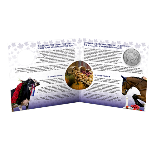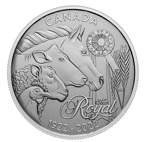 Share your moments from The Royal! Each year, hundreds of thousands of visitors, exhibitors and competitors come together at Toronto’s Exhibition Place for a celebration of excellence in agriculture, local food and equine sport. The Royal Agricultural Winter Fair has grown to become the largest combined indoor agricultural fair and equestrian competition in the world, and 2022 marks a major milestone for this annual event. The Royal’s centennial anniversary is commemorated on our final Moments to Hold coin; its reverse design highlights some of the events and exhibits featured at The Royal, where the champion rosette is the greatest aspiration of breeders, producers, growers and exhibitors alike.
