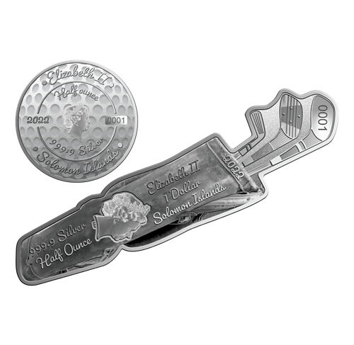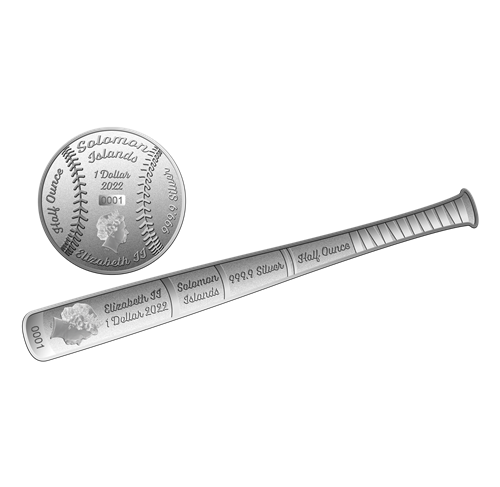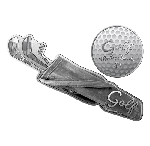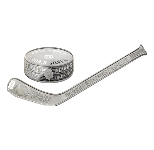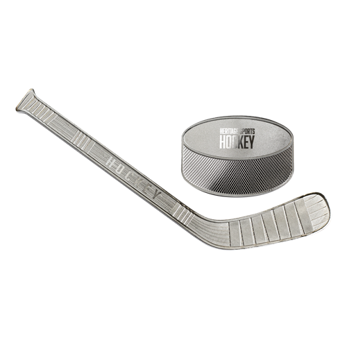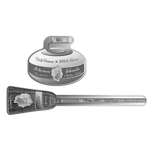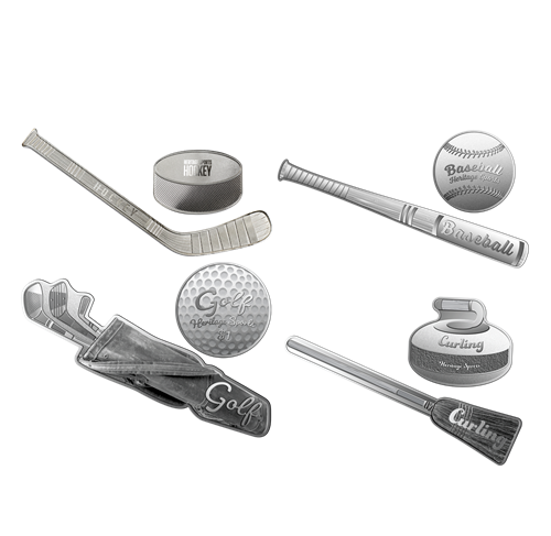 In this four-part series from the Solomon Islands, each set contains two ½ oz. pure silver coins shaped like the equipment needed to play each sport: a hockey stick and puck; a baseball bat and ball; a golf club bag and ball; and a curling stone and broom. Collect them all!