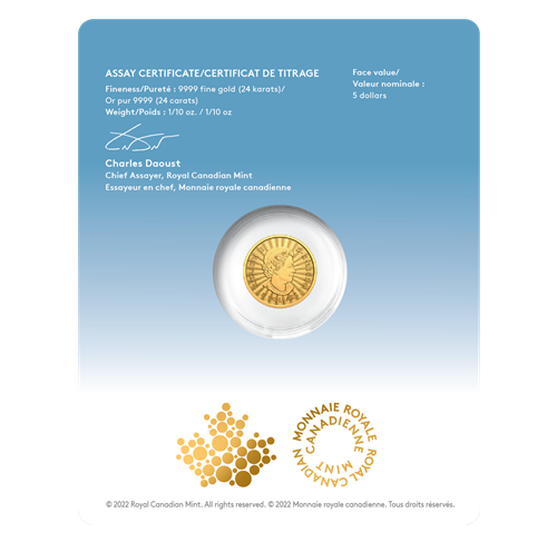 - Easy to collect format. Your pure gold coin comes encapsulated and protected in a premium card holder, wrapped in a clear envelope with a tamper-evident seal. Signed by the Mint’s Chief Assayer, the assay certificate is printed on the back of the card, where it certifies the coin’s authenticity and gold purity.