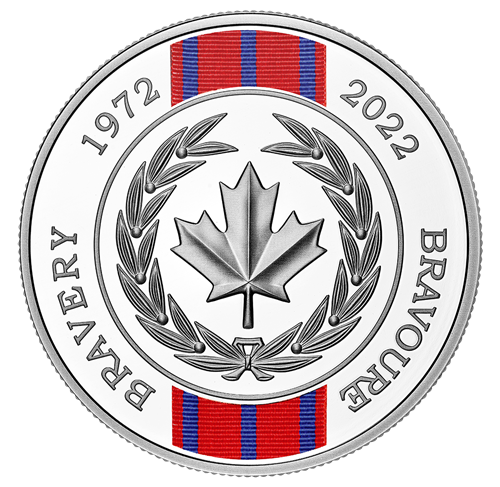 From intervening in an attack to rescuing people from a submerged car, their “acts of bravery in hazardous circumstances” qualify these everyday citizens as everyday heroes among us; and by selflessly risking their lives to save or protect another, they have earned this nation’s gratitude and admiration, as well as one of Canada’s top honours for courage: the Medal of Bravery, which is highlighted on this coin in honour of its 50th anniversary.
