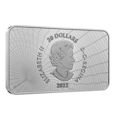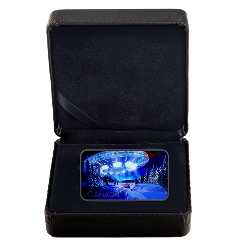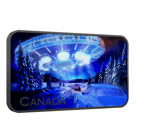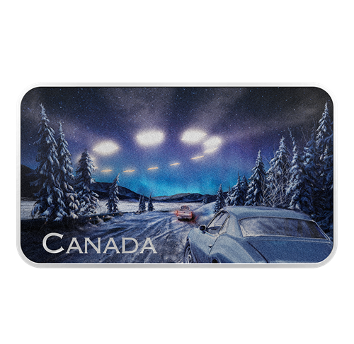 Imagine driving on a snowy highway at night and seeing a row of lights in the sky… and you suddenly realize it’s a giant UFO! This is the scene depicted on our fifth Canada’s Unexplained Phenomena coin, which tells the story of a UFO encounter in the Yukon. On the night of December 11, 1996, at least 31 people in four different areas reported seeing a UFO in the sky. The bright lights described by the witnesses have been re-created on this rectangular coin’s reverse, where a more complete picture of the giant UFO comes into view when the black light paint technology is activated.