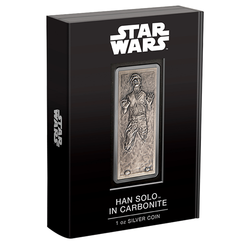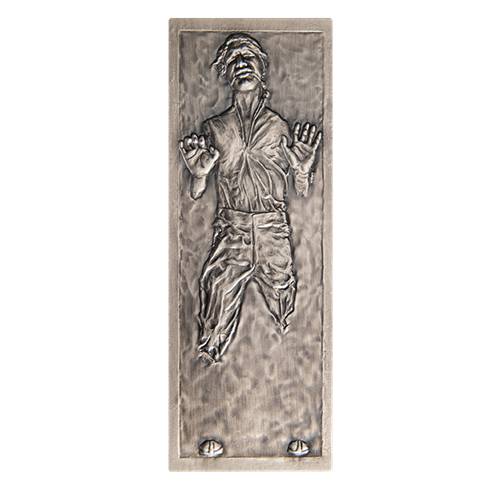 - Pure silver. 1oz pure silver rectangular coin featuring an engraved Han Solo™ frozen in carbonite.