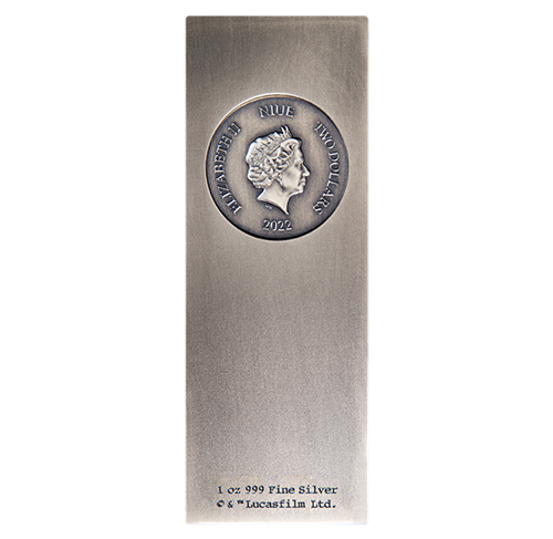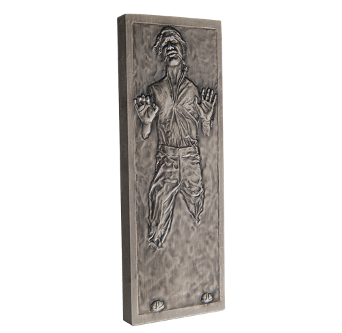 This slab-shaped 1 oz. fine silver coin is a full-length replica of Han Solo™ encased in carbonite, with an antique finish that captures that “frozen in carbonite” look as he appeared in the 1980 movie Star Wars™: The Empire Strikes Back.