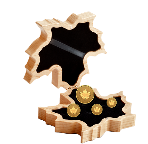 Your four coins are individually encapsulated and presented side-by-side in a wooden case crafted from hard maple and shaped like a maple leaf. Inside the case, your coins are safely nestled in a black velvet insert, while the serialized certificate is held in place on the underside of the lid.