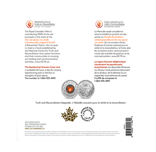 - The Royal Canadian Mint is thankful for the support and contributions the National Centre for Truth and Reconciliation, the Survivor’s Circle, and the Orange Shirt Society have made to this project.