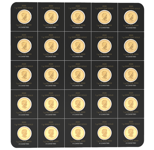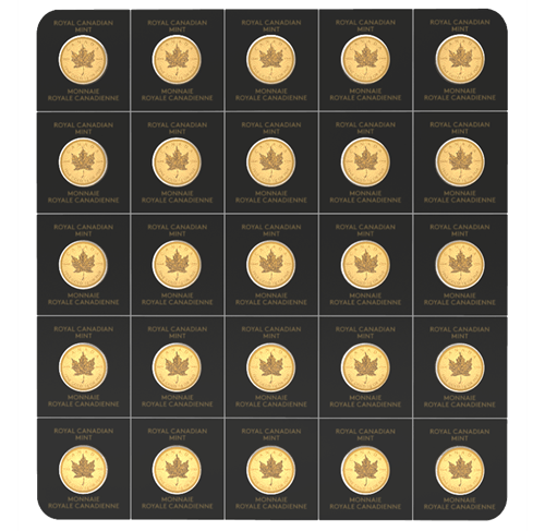 - Divisible blister pack containing 25 Gold Maple Leaf coins, each coin being legal tender weighing 1 g.