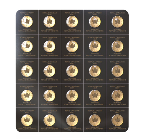 - Divisible blister pack containing twenty-five Gold Maple Leaf coins— each coin is legal tender and weighs 1 gram.
