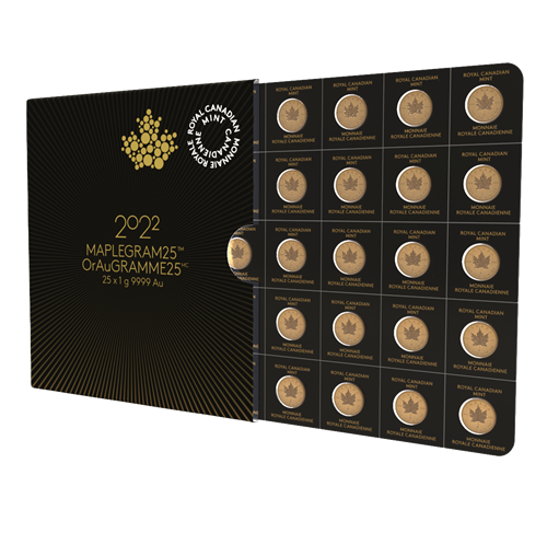 The Royal Canadian Mint is proud to launch the 2022 Maplegram25™, a composite of twenty-five GML coins each weighing 1 gram of 99.99% pure gold, packaged in a divisible blister pack wrapped in an elegant sleeve. Each coin blister has a distinct serial number, and the assay certificate on the sleeve certifies the purity and weight of the coins.